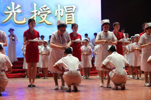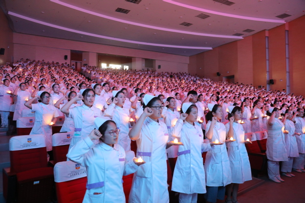 在悠扬的乐曲中,护理学院院长薛松梅为护生们传光,神圣的火种刻画着护理事业新老接替的轮回,体现南丁格尔精神的不灭光辉。在授帽环节,来自临床一线的7位护理前辈为即将进入临床实习的护生代表戴上圣洁的燕尾帽,把象征南丁格尔“燃烧自己,照亮别人”精神的火种传递到下一代护理人手中。随后,护理学院教师代表陈亚南带领所有实习生在南丁格尔像前庄严宣誓,掷地有声的誓言在跳跃的烛光中回荡。最后,仪式在慷慨激昂的合唱《中国护士之歌》完美结束。