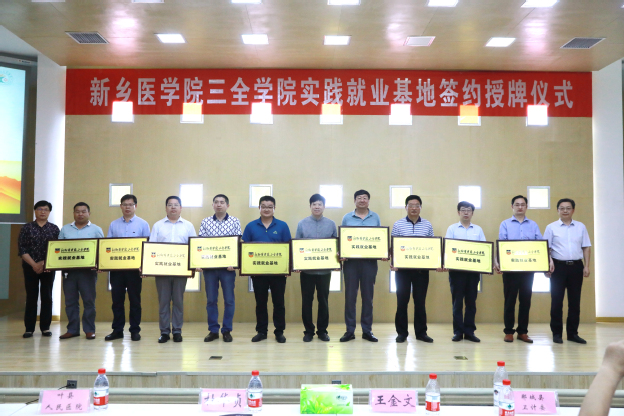 6月13日上午,我校与郸城县人民医院等十家医院在平原校区行政楼三楼学术报告厅举行“新乡医学院三全学院实践就业基地签约授牌仪式”。 郸城县卫计委副主任禹广民,叶县人民医院党委书记冯先炳、纪检委书记张跃军,新野县人民医院院长李洪普,南召县人民医院业务院长胡跃彬,柘城县人民医院业务院长刘运龙,襄城县人民医院业务院长张秋囤,宜阳县人民医院纪检委书记许现伟,郸城县人民医院副院长孟建辉,郸城县中医院副院长王景春,郸城县第二人民医院副院长刘庆彦、刘廷亮,河南信合医院副院长许长东,我校党委副书记王金文、教务长杜华贞出席。学校相关单位负责人以及百余名师生参加。仪式由产教融合办公室主任张东主持。