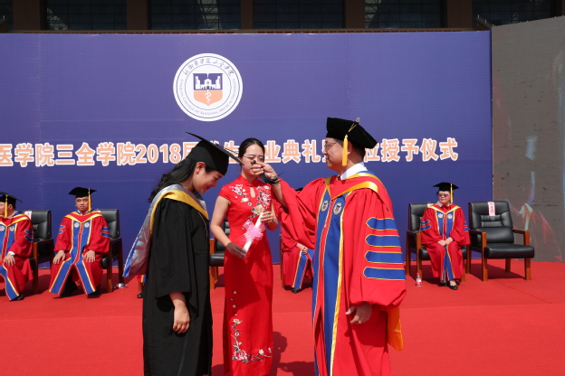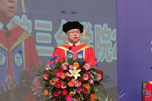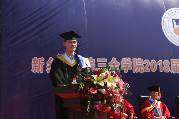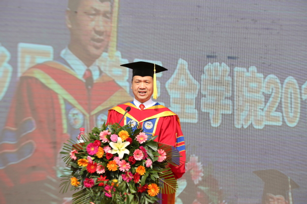 毕业生代表梁鹏波、刘哲彰发言。他们分别代表两校区的毕业生向辛勤培育学生成才的各位领导、老师表达了最衷心的感谢,向多年来辛勤操劳的父母表达了最崇高的敬意,向几年来朝夕相处的兄弟姐妹表达了最真诚的祝福。他们说:“吾辈大好青年,当不忘在三全之所学,让数年的积累绽放在祖国最需要的地方,在伟大复兴路上书写精彩人生”!他们见证了母校的稳健成长,共同祝福母校永立潮头,早日建成“地方性、高水平、有特色、应用型的新型高等医学院校”!