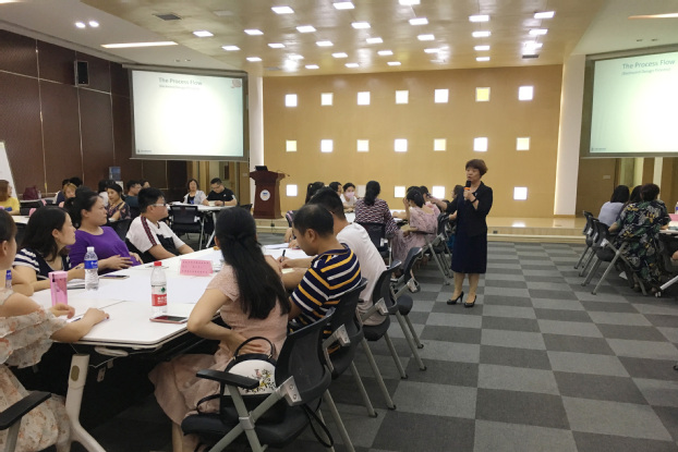 7月14下午至15日下午,张忠芳运用分组教学的方法,将不同教研室的教师以10人为一组的方式分组,形成工作坊,深入指导教师如何实施OBE。她组织教师们以小组形式讨论学习,并围绕专业教育目标及专业学习成果的设定、课程学习目标及学习成果的设定进行实际操作。在实际操作的培训中,教师们展开激烈的讨论,分享各自的观点,培训氛围十分活跃。