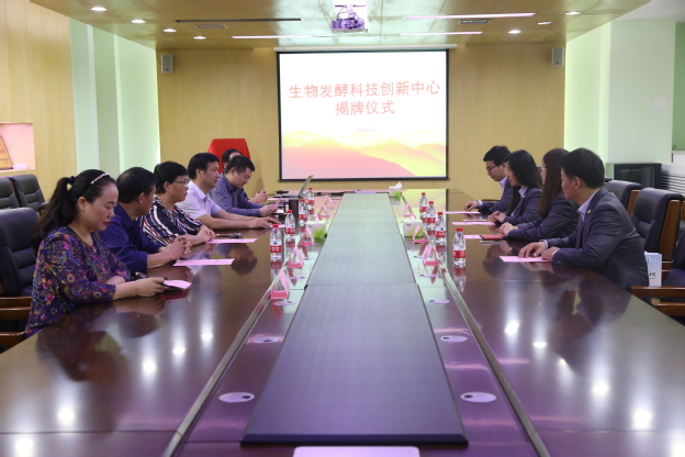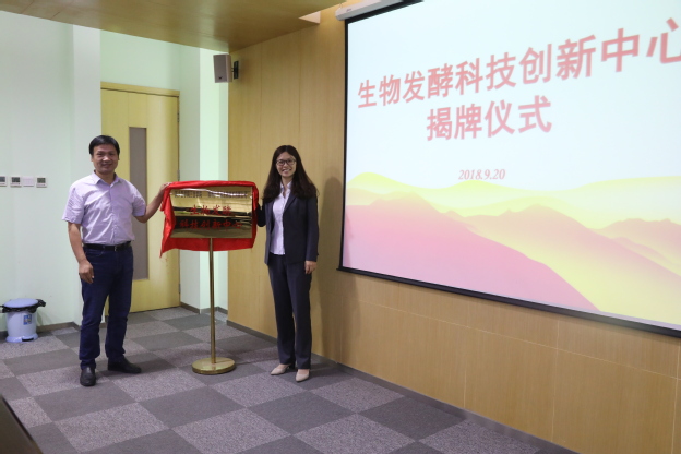 在热烈掌声中,王彦杰和李欢欢共同为“生物发酵科技创新中心”揭牌并合影留念。