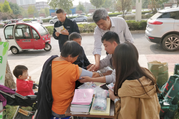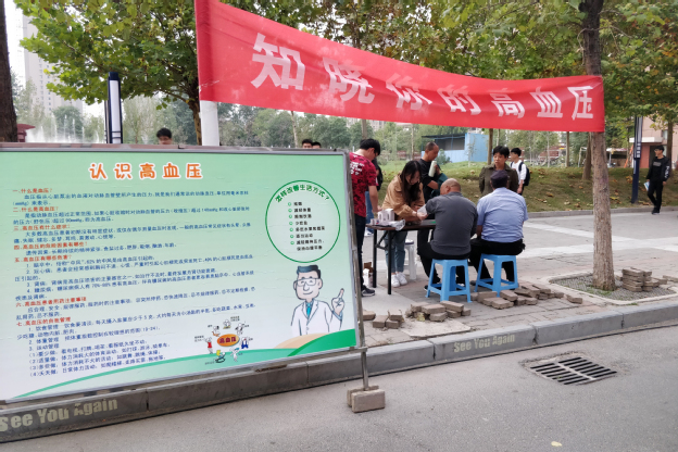 上午8点多,志愿者便来到了活动现场,将仪器设备、桌椅板凳、宣传横幅、展板摆放到位,对小区居民和过往行人发放健康知识宣传彩页,吸引了不少人停下脚步驻足观看。咨询台前,学生志愿者热情耐心地为居民免费测量血压,谷韶平教授详细的解释居民提出的各种问题,详细了解他们的生活习惯和患病时间,根据其自身情况提出针对性较强的治疗方案,受到了前来咨询者的高度评价。