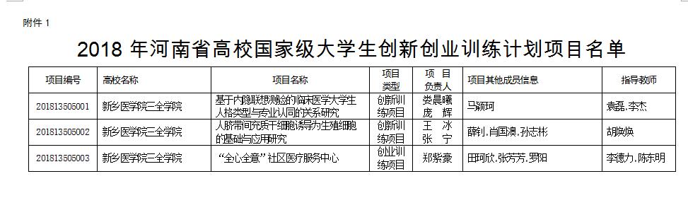 近日,河南省教育厅发布《关于公布2018年国家级和省级大学生创新创业训练计划项目名单的通知》教高〔2018〕987号,依照省教育厅规定,我校满额申报的10项“大学生创新创业训练计划项目”通过教育部和省教育厅审核并立项。其中,“人脐带间充质干细胞诱导为生殖细胞的基础与应用研究”和“基于内隐联想测验的临床医学大学生人格类型与专业认同的关系研究”2个项目入选国家级大学生创新训练项目,“全心全意”社区医疗服务中心”项目入选国家级大学生创业训练项目,“全国标准化病人(sp)培训基地”等7个项目入选河南省大学生创新创业实践项目。