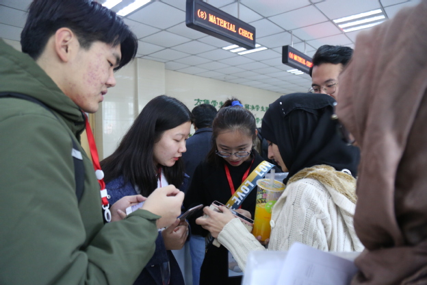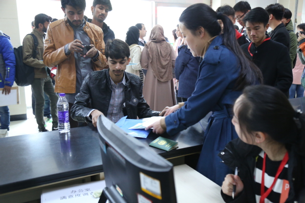 为全面、细致、有序的做好国际学生的迎新工作,我校专门成立国际学生迎新工作小组,全面负责迎新工作的总体部署和协调。学校专门编发中英双语迎新专刊,报到现场展架上用中英双语展示报到流程和注意事项,教室、宿舍、超市等区域配置英文指示牌便于国际学生识别。超市生鲜区设置清真肉制品等冷藏食品专柜,就连导购员也进行英语培训。一系列措施在学校内营造了浓厚的迎新氛围,使国际学生感受到了家一样的温暖,帮助他们适应新的环境,更快的融入新生活。