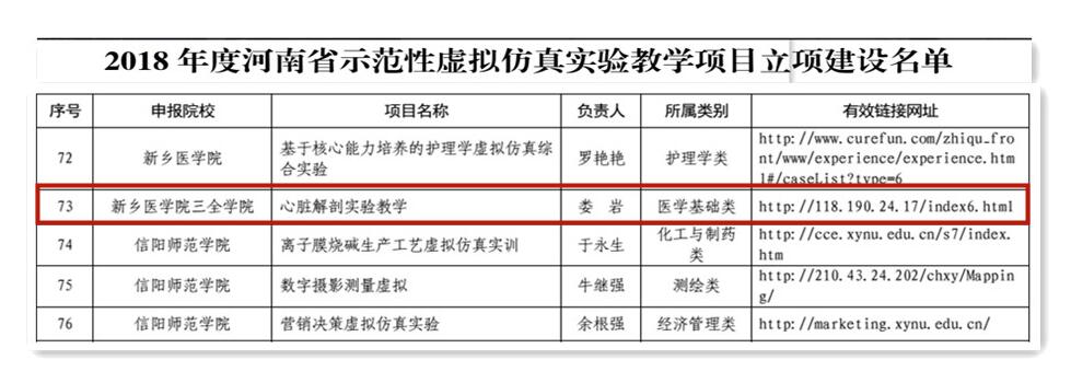 近日,河南省教育厅发布《关于公布2018年度河南省示范性虚拟仿真实验教学项目立项建设名单的通知》(教高〔2018〕991号),对2018年度河南省示范性虚拟仿真实验教学项目立项建设名单予以公布,我校娄岩教授负责的基础医学类《心脏解剖实验教学》喜获立项。