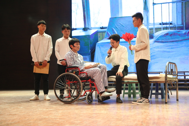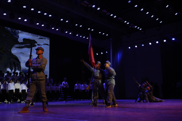 晚会以诵读、歌曲以及情景剧的形式展开。活动伊始,全场肃立,奏唱国歌。随后百人诵读《长征的记忆》拉开了晚会的序幕,演员们展现了红军长征时期飞夺泸定桥、爬雪山、过草地的感人画面,歌颂了红军不畏艰险、勇往直前革命精神。情景剧《难忘红蘑菇》讲述了以邓稼先为代表的两弹元勋,在条件极其艰苦的情况下制造出国之重器——原子弹的故事。他们隐姓埋名28年,在布满荆棘的不归路上奋力前行,虽然他们的名字鲜为人知,但他们的贡献永垂青史。情景剧最后演员们齐唱《中国男儿》更是引起全场热烈的掌声。情景剧《裘法祖》讲述了“中国外科之父”裘法祖因为母亲因病去世而致力医学、认真学习、潜心研究,最后终成一代医学大家的故事。演员们惟妙惟肖的将跌宕曲折的情节展示给观众,故事引人入胜,人物形象丰满,动人的场景使观众泪目。情景剧最后,在主持人的带领下,全场观众起立,齐读医学生誓词,铿锵有力的誓词将晚会推向了最高峰。