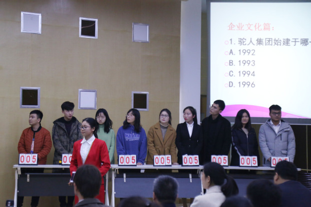 经过层层选拔,共有九组选手晋级总决赛,决赛分为抢答和自我展示两个环节。抢答环节中,队员们针锋相对,丝毫不让,“驼人企业价值观是什么?”“应用创新,百年驼人,扶残助残”,“市场营销4P理论的4p,分别是什么?”“产品、价格、渠道、促销”,主持人话音刚落,选手们便争相作答,从驼人集团企业文化到市场营销基础知识,无形的硝烟弥漫了整个舞台。