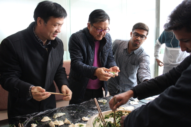 在包饺子环节中,我校领导及崔锡淳、文秀教授饶有兴致,纷纷加入,与国际学生们欢聚一堂。考虑到留学生们对中国传统文化包饺子及流程不太了解,志愿者们一边详细解说,一边耐心示范。国际学生们目不转睛,对志愿者擀出的薄薄的饺子皮竖起了大拇指。志愿者讲解完后,留学生们跃跃欲试,对擀饺子的用具仔细研究后才开始着手尝试。动手之余,崇德书院领导与贫困学生们谈心,详细了解了贫困生的家庭经济情况、学习情况。同时,学校校领导和书院的老师们一起示范、指导国际学生们包饺子,讲述“冬至”节日的由来。经过一个多小时的忙碌,国际生们端着自己的“战果”相互“攀比”,并拿着饺子与志愿者们合照记录下此刻的美好。