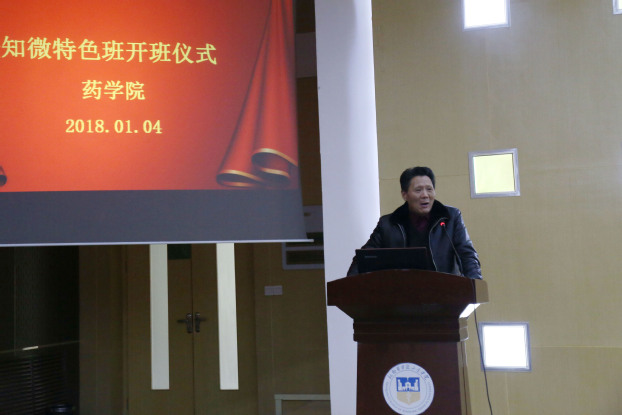 开班仪式上,闫福林代表我校药学院对知微生物医药有限公司一行表示热烈欢迎。他表示,开办“知微药学特色班”是今年我校药学院的重点工作,旨在选拔和培养专业知识过硬,实验能力强,毕业能够直接从事药物研究与开发、药物生产与管理等方面工作的专门技术人才,感谢知微生物医药公司为我校师生提供的良好平台。