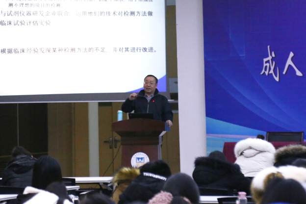 1月13日上午,我校特邀新乡医学院王辉教授和武警总医院高艳红教授为我校成人高等教育2019级新生开展面授讲座,两场讲座在平原校区学术报告厅和教学楼B102教室同时进行,检验和护理专业成教新生与普本师生400余人聆听观摩。两场讲座分别由我校教育总督导毛兰芝和继续教育学院院长陈扬主持。