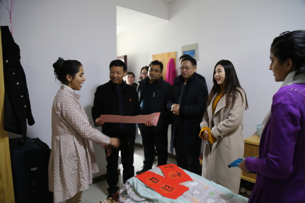在留学生公寓,校领导为这些远在异国他乡的学子们送去了带有浓厚传统文化氛围的新春佳节祝福,发放了春联、元宵等春节慰问品,并向留学生介绍了中国的春节习俗,鼓励大家通过亲历中国传统节日,切身感受和认识中国文化。留学生也向大家展示了自己书写的春联,在欢乐、融洽的氛围中,校领导们和留学生们一起现场贴起了春联。留学生们纷纷表示,虽然身在异国他乡,不能回国和家人团聚,但学校领导带来的关心和祝福让他们倍感温暖和幸福,让他们真真正正体会到了中国浓浓的年味儿。