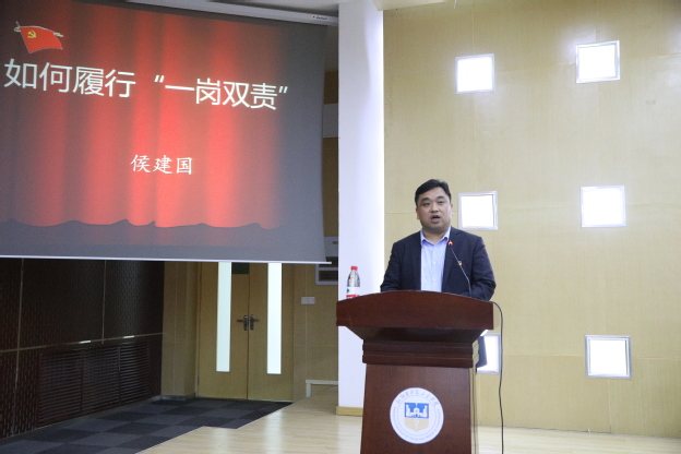 侯建国以《如何履行“一岗双责”》为题,讲解了什么是“一岗双责”、“一岗双责”中党风廉政建设责任和全面从严治党责任是什么责任、“一岗双责”中党风廉政建设责任和全面从严治党的责任内容这三个内容。他指出,学校党委深化各级领导干部对“一岗双责”主体责任工作的重要认识,就是深入落实新时期党提出的总要求的重要途径;党组织领导班子明确“问责应当分清责任”主体内容,就是明确如何承担全面领导责任、主要领导责任和重要领导责任;各级领导干部深入学习《中国共产党纪律处分条例》文件,从遵守政治纪律、组织纪律、廉洁纪律、群众纪律和工作纪律五个方面入手,学会弄懂履行“一岗双责”中全面从严治党责任的着力点。