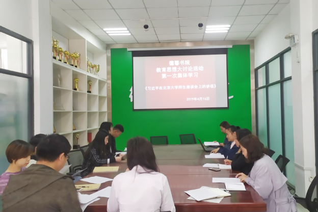 4月16日上午,德馨书院党总支教育思想大讨论第一次集体学习在书院会议室举行,该书院党总支全体教职工参加。德馨书院党总支书记金靖芝主持会议。