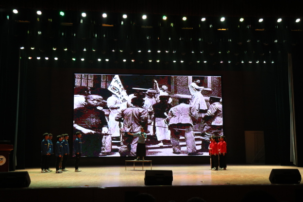 在“百年五四,薪火相传”环节,伴随着一段巴黎和会中国外交失败的视频,情景剧《五四那一天》拉开了序幕,一群身穿五四装的青年学生从报纸上得知巴黎和会中国外交失败的事实,决心开始通过示威游行、请愿等多种形式进行反抗,但因为他们的力量不足以对抗政府,他们又到广大群众、市民、工商人士等阶层中去宣扬,有了这些阶级的支持,五四运动达到了高潮,“废除21条”、“外争国权,内除国贼”的口号在礼堂上空回荡,一时间现场气氛高涨。