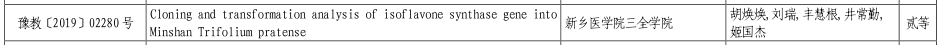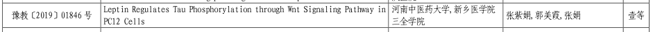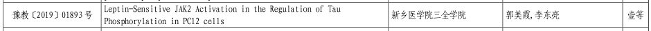 近日,河南省教育厅印发《关于公布 2019 年度科技成果奖奖励名单的通知》(教科技〔2019〕378 号),公布了2019年度河南省教育厅科技成果奖获奖名单。我校基础医学院教师郭美霞发表的论文《Leptin-Sensitive JAK2 Activation in the Regulation of Tau Phosphorylation in PC12 cells》荣获一等奖,生命科学技术学院教师胡焕焕发表的论文《Cloning and transformation analysis of isoflavone synthase gene into Minshan Trifolium pratense》荣获二等奖。此外,郭美霞以第二作者发表的论文《Leptin Regulates Tau Phosphorylation through Wnt Signaling Pathway in PC12 Cells》荣获一等奖。