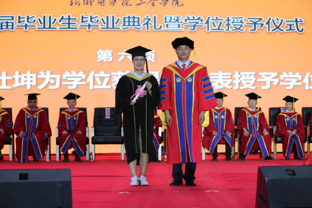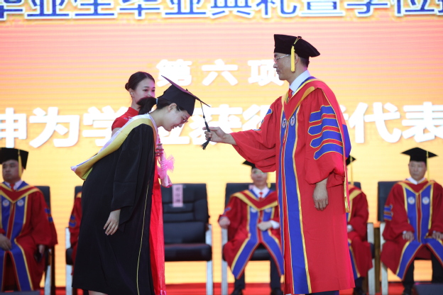 在神圣庄严的气氛中,胡仕坤院长为学士学位获得者代表扶正流苏,授予学位证书。