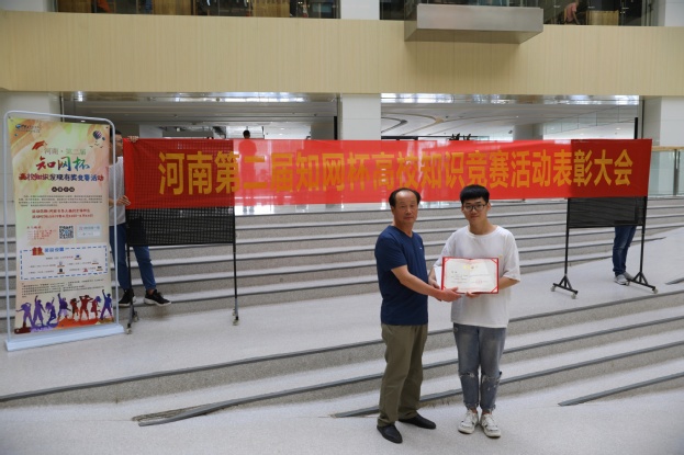 本次比赛以网上报名参赛答题的形式进行,河南省参与高校达76所,参赛学生近3万人,经过一个月的激烈比拼,我校共参与学生114人。为表彰我校取得的优异成绩,同方知网(北京)技术有限公司河南分公司特于6月19 日来到我校,代表河南省高等学校图书情报工作委员会在图书馆一楼中庭举办了颁奖仪式,图书馆馆长华玉民作为颁奖嘉宾为获奖学生颁奖。据悉,本次比赛特等奖全省仅此两名,我校殷凯同学占据其一。