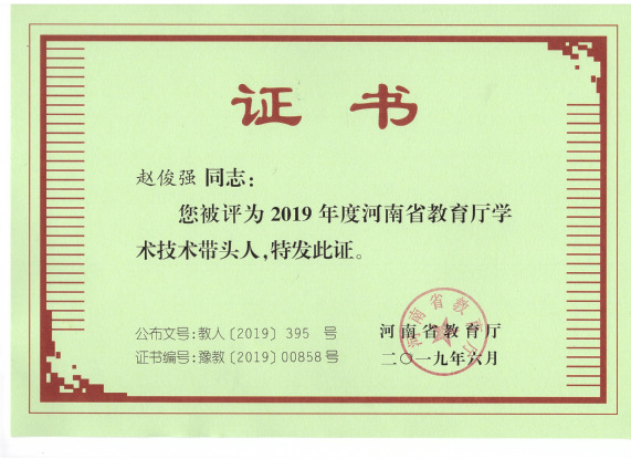 近日,省教育厅公布2019年河南省教育厅学术技术带头人评选结果,我校副教授赵俊强荣获“2019年度河南省教育厅学术技术带头人”荣誉称号。