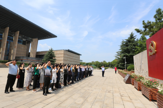 南湖革命纪念馆位于嘉兴南湖东岸,在这里,中国共产党的先驱们从上海转移到南湖的红船上,也是在这里中国共产党第一次全国代表大会胜利召开,并确定了党的第一个纲领和决议,以及中央领导机构。全体党员怀着崇敬的心情,走进了南湖革命纪念馆。展厅共有三层,分为“开天辟地”和“光辉历程”两大主题。展馆内以 3D 影像、雕塑、蜡像等技术再现了真实的历史场景,让人身临其境,深刻感受这段伟大的革命史记。参观完纪念馆,全体党员来到红船前,高举右手,庄严地重温了入党誓词。