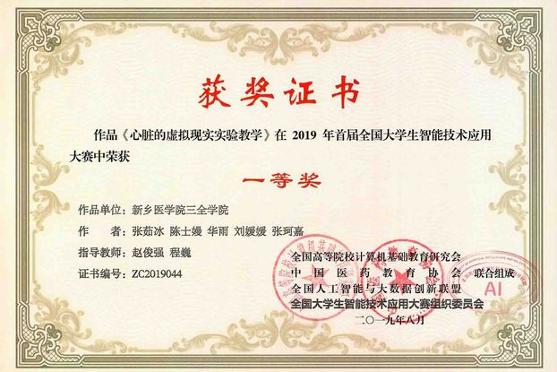 8月15日,首届全国大学生智能技术应用大赛总决赛在山东省烟台市滨州医学院举行。我校17级电子科学与技术专业张珂嘉、刘媛媛等同学组成的“心脏的虚拟现实实验教学”代表队,17级假肢矫形工程专业王康欣、付子博组成的“智能下肢功能代偿及步态矫形器”代表队分别荣获一等奖和三等奖。