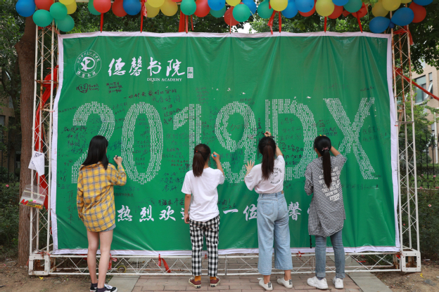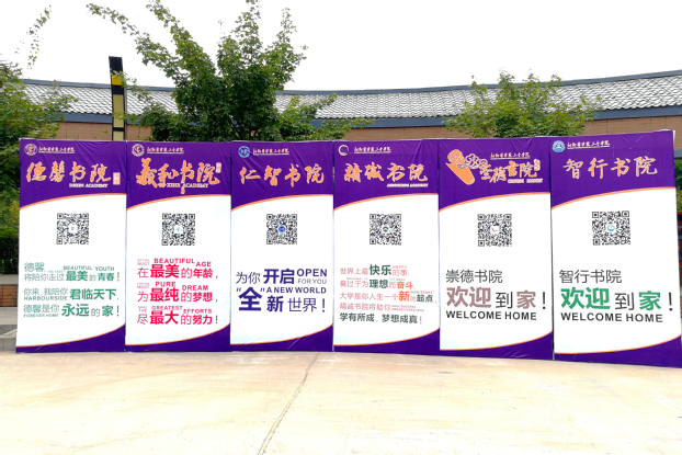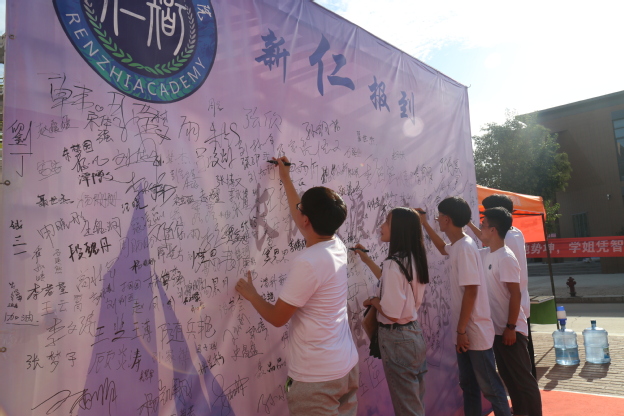 各书院在保证新生按照正常流程办理入学手续的基础上,准备了各具创意的迎新活动,吸引着“小石臼”们的目光,也赢得了学生家长的一致好评。仁智书院“新仁报到”的书写墙上写满了新生的姓名,不仅是身份的确认,更昭示着新的人生旅途的开始;羲和书院门口三个卡通人物吸引了不少新生和家长的注意,“我要做学霸”“我要做女神”等字句给人带来信心和勇气;精诚书院用4只色彩鲜艳、可爱活泼的“大橙子”,与新生们来一次与众不同的“邂逅”;崇德书院启动“时光邮筒”,让新生和家长在明信片上写下各种祝福,用一颗感恩的心大声说出自己的爱;德馨书院用全部新生的名字拼成“2019DX”图样,从入校就培养新生对书院的归属感;智行书院巨大的条幅悬挂在楼宇之上气势壮观,智能机器人“图图”应邀来到现场与新生亲密互动,夺人眼球。