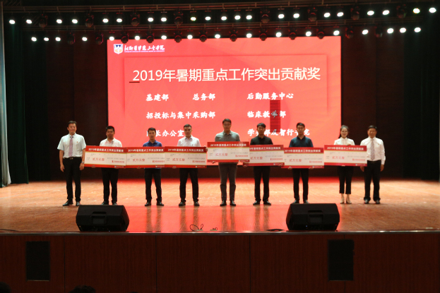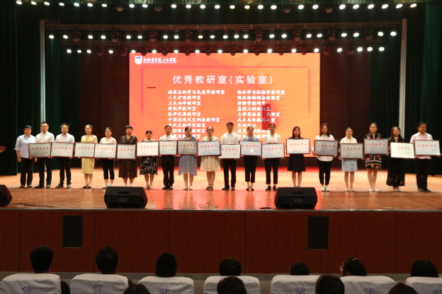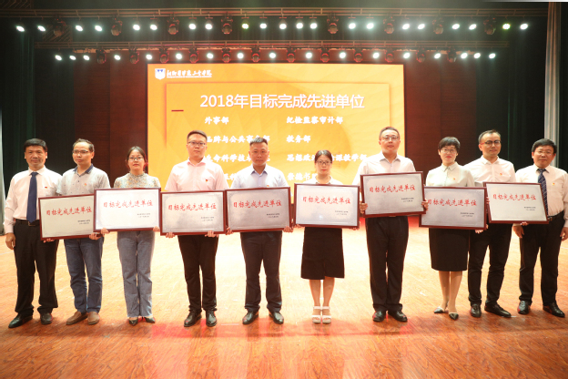 2018年目标完成先进单位分别为外事部、纪检监察审计部、品牌与公共事务部、教务部、生命科学技术学院、思想政治理论课教学部、光明眼科学院、崇德书院;进步奖分别为外事部和光明眼科学院;创新项目奖分别为学务部、基础医学院和羲和书院;优秀教研室(实验室)分别为病原生物学与免疫学教研室、组织学与胚胎学教研室和人文护理教研室等18个教研室;2018年十佳人物分别为宋小峰、吕庆波、千惠、杨清云、李爽、朱性海、李高杰、王桂琴、郝雷、常青等10位老师;董事长特别奖分别为曹瑾玲和樊永兵;2018-2019学年优秀教师分别为李勇莉、王静、申家字等100位老师;2019年暑期重点工作突出贡献奖分别是基建部、总务部、后勤服务中心、招投标与集中采购部、临床教学部、院长办公室、学务部及智行书院;建设贡献奖分别授予王金文、王彦杰和沈雁霞三位领导,感谢他们十多年里为学校各项事业发展做出的重大贡献。