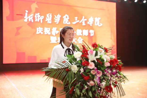 学生代表、崇德书院刘玥涵同学发言。她代表全体学生向老师们表达最真挚的祝福和最衷心的感谢。她说,教师是世界上最平凡、最伟大的事业,老师的关怀让离家求学的学子们感受到家的温暖,老师的教导让同学们找到前进的方向,同学们要力争上游,不断奋进,以回馈教师的恩情。
