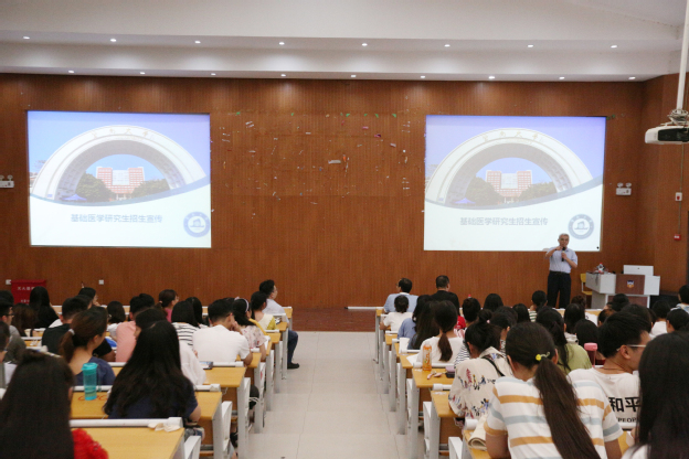 郭国庆教授详细介绍了暨南大学的校貌、招生专业概况(学位点、师资、培养模式、奖助体系、研究生招生政策、就业情况等)和医学相关学科研究生教育的优势与特色。他希望我校广大学子努力学习,为医学事业做出自己的一份贡献。随后,孟宪军书记从医学生的职业规划,视野开拓等方面进行阐述,鼓励学生多出去走走,多出去看看,多出去学学。