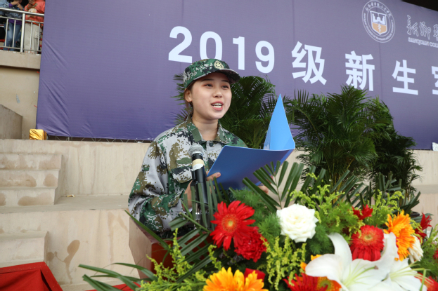 精诚书院2019级护理专业(中外合作办学)学生祁琪作为新生代表发言。她说道,军训的14天,是每一个大一新生蜕变重生的14天;是学生们懂得坚强、学会坚强的14天;是挑战自我、超越自我的14天,身为一名三全学子,同学们都要以报国之行践行爱国之志,都要以一己之力,成为母校荣光。