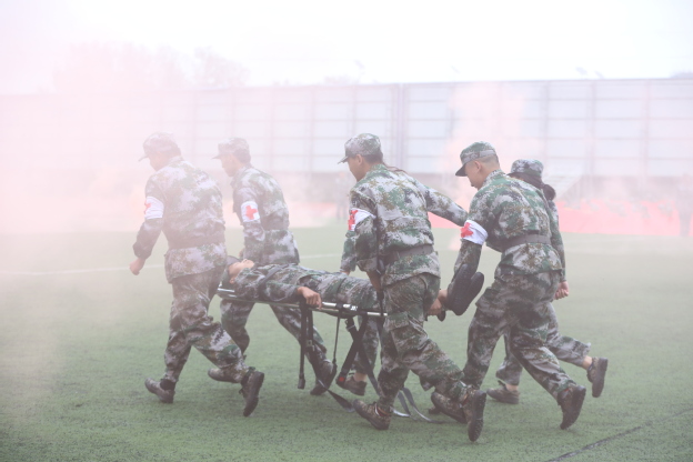 随后,各书院依次进行特色方阵表演,仁智一营惊心动魄的战场救护、羲和二营精彩纷呈的擒敌拳、精诚三营整齐划一的军体拳、崇德四营“祝您平安”的旗语操、德馨五营英姿飒爽的匕首操、智行六营气势磅礴的手语操,一招一式都展现出军人热血潇洒的英雄气概,再次彰显了三全学子的青春与活力。