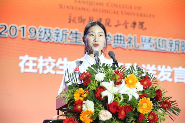 在校生代表精诚书院2017级药学专业学生王秋洋发言。她代表全体在校生欢迎2019级新同学来到“全”世界,并以自己的求学经历告诉新同学,在未来这宝贵的几年里,不要害怕,要去尝试、去寻找、去改变、去探索一切的可能,不要把最年轻的时光交给了循规蹈矩的人生。王秋洋鼓励2019级新同学尽快调整好心态,适应大学生活节奏,宽泛地阅读,享受求学路上的孤独,以自己的方式越活越优秀。