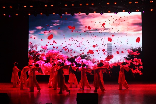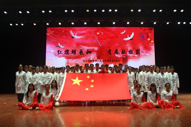 篇章二:八方展风采,师生共祝福。柔中带刚的舞蹈《映山红》让观众仿佛感受到当年对红军归来的期盼与牵挂。随后播放羲和书院新老校区和七个教学基地包括2015级—2019级共4000余名羲和学子合拍的祝福视频。视频以1919年五四运动为引,包含了中国近百年的沧桑巨变,展现了建国以来祖国取得的伟大成就。视频结尾,在羲和书院党总支书记崔向前的带领下,书院全体老师身着正装,佩戴党徽,站在国旗后对祖国深情祝福:“在新中国七十周年华诞之际,羲和书院党总支祝祖国更加繁荣富强,生日快乐!”,表达对祖国母亲70华诞的深情祝福。图书馆前,羲和学子们以方阵高高托举起国旗和党旗,并在后方摆出“70”字样的队形,祝愿祖国更加繁荣昌盛;校外培训基地的羲和学子在自己的岗位上守卫国民的健康,作为祖国医药卫生事业的守护者,由心地祝愿祖国母亲屹立不倒,国泰民安。接着,党总支副书记刘小磊带领书院全体辅导员老师献上诗歌朗诵《我的祖国》,老师们激情澎湃,情绪饱满,充分表达三全人满腔的爱国之情。