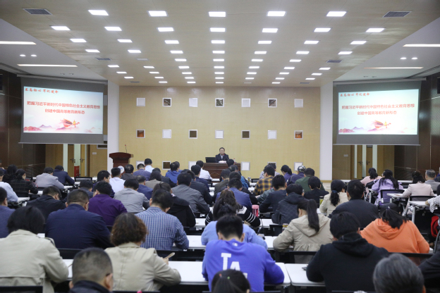 为推进“不忘初心、牢记使命”主题教育活动向纵深发展,引导广大党员干部提高思想认识,坚定理想信念,10月12日下午,我校党委书记杨捷以“把握习近平新时代中国特色社会主义思想,创建中国高等教育新形态”为题,在行政楼三楼报告厅为我校党员干部讲授主题教育专题党课,全体校领导、中层管理人员、党支部书记共计150余人参加。专题党课由我校党委副书记张钢主持。