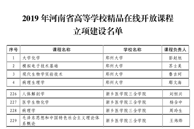 日前,河南省教育厅下发了《河南省教育厅关于公布2019年河南省高等学校精品在线开放课程立项建设名单的通知》教高〔2019〕671号,我校基础医学院《人体解剖学》、《医学生物化学》、《病理学》3门课程和思想政治课理论教学部《毛泽东思想和中国特色社会主义理论体系概论》获得立项建设,是历年立项课程最多的一年,也是全省民办及独立学院立项最多的院校之一。