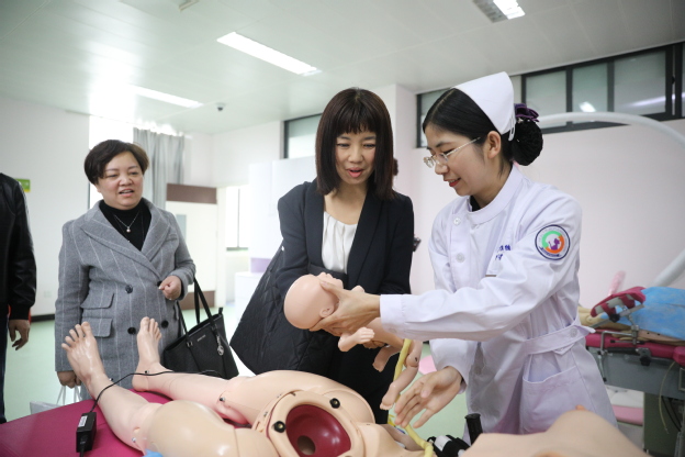 在胡仕坤等人的陪同下,叶青一行先后参观了我校图书馆、挪度(国际)护理实训中心、康复学院、医学影像实训中心、口腔医学技术实训中心和干细胞实验中心,叶青一行对我校以学生为本的办学理念、特色鲜明的“双院制”育人模式、一流的教学设施以及精细化的管理予以称赞。