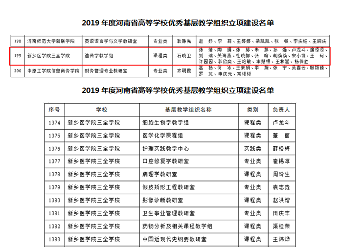 其中,我校《遗传学教学组》喜获2019年度河南省高等学校优秀基层教学组织立项建设,《细胞生物学教学组》《医学化学课程组》《护理实践教学中心》《口腔修复学教研室》《病理学教研室》《假肢矫形工程教研室》《影像诊断教研室》《卫生事业管理教研室》《药物分析及相关课程教学组》《中国近现代史纲要教研室》获得2019年度河南省高等学校合格基层教学组织备案。
