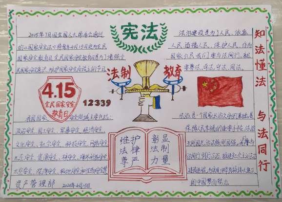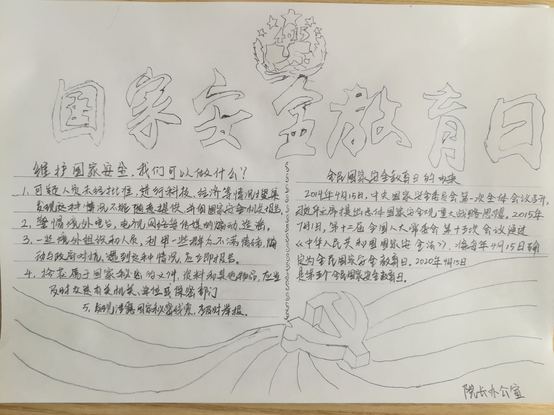 制作一次安全法制教育手抄报。各党支部紧扣主题,多角度、多层次制作手抄报。机关职工第三党支部王二霞表示,在与家人一起制作手抄报的过程中,对国家安全有了进一步认识,不仅增强了自身的国家安全观念,更激发孩子的爱国爱党的热情,用自身行动让孩子从小培养国家安全意识,使不法分子无机可乘。