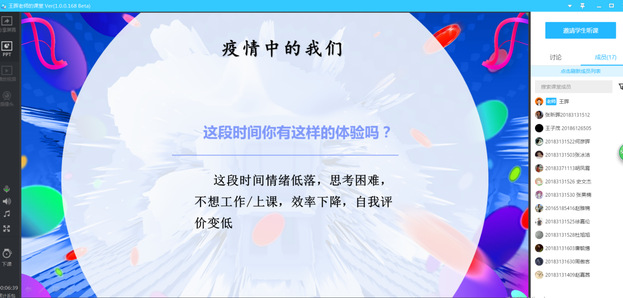 在学生中广受关注的B站上发表自制的视频《疫情期间待在家里心情低落的我们可以做些什么》,以这种更容易被同学们接受的方式,给同学们提出居家隔离期的小建议,比如学习、自制美食、锻炼身体等。