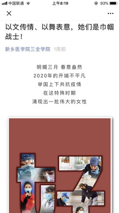 为丰富疫情隔离期间的家庭生活,我校“春风摇曳女人节·魅丽巾帼半边天”三八节系列活动通过线上方式如期开展。该系列活动共分四个子活动,即“以文传情,最美的她”征文比赛、“视频展示,居家女王”视频比赛、“快乐运动,健身达人”瑜伽线上课程和“内外兼修,遇见最美” 健康直播。“以文传情,最美的她”征文比赛中,仁智书院李志芳老师的《亲爱的孩子,携手战役,与你同在》,将辅导员比做母亲,把学生比作孩子,字里行间充满了对学生的谆谆教导和殷切期盼。