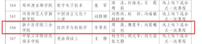 近日,河南省教育厅下发了《关于公布首批河南省一流本科课程认定结果的通知》,我校基础医学院杨保胜教授主持的《医学分子生物学》和李勇莉教授主持的《组织学与胚胎学》课程分别荣获河南省线上、线上线下混合式一流本科课程。