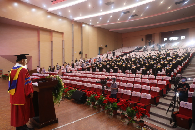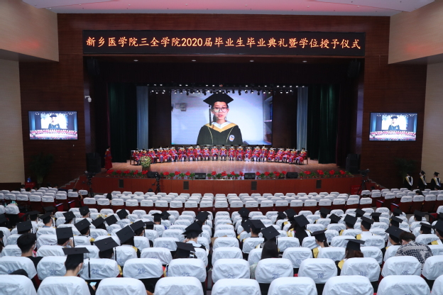 凤凰花开季,毕业离别时。6月16日上午,因新冠肺炎疫情沉寂了6个月之久的三全校园,随着毕业生代表的返校,再度焕发出无限生机与活力。下午,我校2020届毕业生毕业典礼暨学位授予仪式在平原校区闻德礼堂举行。为保障最广大师生的健康安全,我校精心筹备了一场“云”毕业典礼。新乡医学院党委委员、副校长朱武凌,新乡医学院三全学院全体院领导、学位评定委员会委员、家长代表、各书院负责人、毕业班辅导员及2020届毕业生代表82人出席,6000余名毕业生在线观看直播。典礼由副院长袁磊主持。