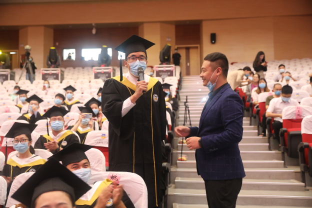 教师代表郭明好教授登台发言。面对即将离开三全的2020届毕业生提出了人生新阶段“第一问”——你到底该成为什么样的人?他用诙谐、幽默的语言与同学们分享疫情期间“居家隔离”的感悟,调侃同学们被放了“历史上最长的假”。同时佐以生动丰富的事例,用轻松的语气描绘了疫情过后的生活百态,宽慰大家这是比往届多上了一堂可遇不可求的课。既让同学们感知到生命的可贵,又传递出乐观向上的生活态度。随后,他向同学们深刻解读了“成为什么样的人”这个充满阶段性的问题。他希望同学们打出三张好牌:首先要认清现实、实事求是的去保持个性鲜明,善于发现自己的优势,并加以合理利用;其次,希望每位同学都有“两只手”,一只帮助他人,一只帮助自己,不论严寒酷暑,做个温暖如春的人;最后,还要学会调整心态,保持豁达与谦卑,做一个有家国情怀和社会责任感的知识分子。