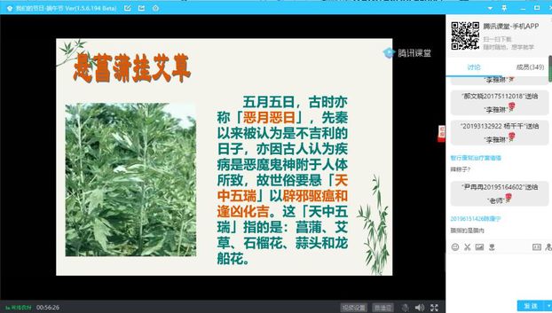 6月18日,通过“云课堂”的方式,崇德大讲堂之端午文化活动开讲,主讲人为《走进中国传统节日》课程负责老师李雅琳。这是崇德书院在重大节庆日前举办的惯例活动,全校来自各年级各专业的500余名学生在线聆听了此次讲座。李雅琳就端午节习俗有关的问题与学生展开互动,并通过韩国申遗“江陵端午祭”事件重点讲解了作为当代大学生弘扬和传承端午文化、中华传统文化的必要性和紧迫性,整场讲座内容丰富、生动有趣,学生热情高涨,课堂气氛活跃。