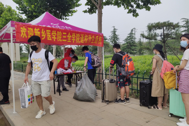 宋君同学是乘坐高铁返校的。她一出车站大厅,就看到几个穿着红马甲、高举着“新乡医学院三全学院”牌子的志愿者在张望。她说明身份后,就被志愿者引领到体温检测处测体温、做登记,一切正常后,才被引领登上凉爽的大巴。在宿舍,她对学校的爱心服务也赞不绝口,尤其对校领导送来的午餐念念不忘:“听到敲门声后,我去开门,发现竟是院长,他笑着说该吃饭了,就递给我一个饭盒。饭盒里面是学校精心准备的套餐,不仅美味,还有一种激励人心的作用,我们顿时就被暖到了。” 在简单收拾好床铺后,她就打开了书本,开启学习模式。