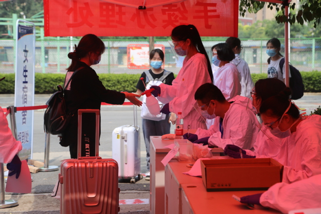 党员教师以志愿者的身份,活跃在学生返校的各个现场环节。学务部的周老师主要负责在高铁东站接送学生。上午8点10分到车站,一个半小时后才迎来了第一波学生。为了让学生们一出车站大厅就能找到学校的专车,他和同事们中午轮流吃饭,不留空档。他说:“今天我们一共接了6拨学生,都顺利地送到了学校。虽然接站比较累,胳膊晒得火辣辣地疼,可看到学生们出站后欣喜的眼神,感觉所有的忙碌都是值得的。”