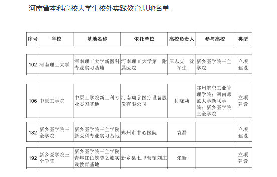 7月6日,河南省教育厅官网发布了关于河南省本科高校大学生校外实践教育基地名单的公示通知,公布了首批河南省大学生校外实践教育基地建设项目名单,我校共获批4个立项建设项目,其中“新乡医学院三全学院—郑州市中心医院校外实践教育基地”和“新乡医学院三全学院—刘庄展览馆史来贺同志纪念馆校外实践教育基地”为我校独自立项建设项目,“河南翔宇医疗设备股份有限公司”是我校参与中原工学院共同建设项目,“河南理工大学第一附属医院”是我校参与河南理工大学共同建设项目。