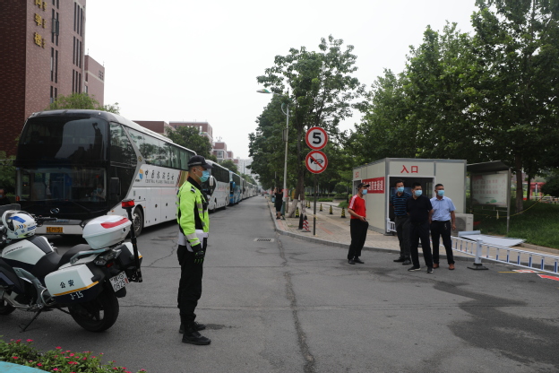 送考时,我校在新乡校区校门前设置了隔离栅栏,并在每辆送考车前设有两个考生专用通道,对所有考生进行身份证、准考证、口罩等物品检查。同时,送考现场还配备了体温检测方舱设备,消毒液、洗手液、消毒湿巾等,方便学生和考务人员随时取用。本次送考工作对送考车辆也制定了严格的送考标准,爱心司机需持绿色健康码、佩戴口罩上车;要求做到一车一日四消毒,对车厢内外全面喷洒消毒液,对容易接触的扶手、座椅、拉手等部位进行重点擦拭消毒等。