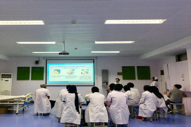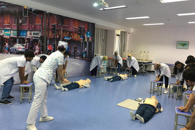 为了保障急救技能培训质量,外事部与护理学院积极沟通,制定了为期三天的授课计划与考核方案,抽调护理学院优秀骨干教师开展全程英语的急救技能培训课程。其中人文护理教研室张文熙、闫浚玮两位老师负责教授心肺复苏术、搬运术,临床护理教研室侯艳飞、李丹两位老师负责教授海姆立克急救法、止血、包扎和固定。