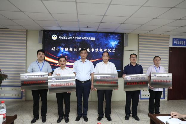 会议还进行了硕士学位授权点共建单位授牌仪式和硕士研究生兼职导师聘任仪式。经过前期与各合作单位充分沟通、调研,确定温县人民医院、汝州市第一人民医院、新郑市人民医院、登封市人民医院、平舆县人民医院等联盟副理事长单位为我校硕士学位授权点共建单位。经前期考察和校领导小组审批,确定郝国、胡现增、王广军、高峰杰、王铁珍、徐银领、赵卫兵、宋亚峰、丁钦慕、王永强、杨杰、于冬梅同志为我校硕士研究生兼职导师。院长胡仕坤为共建单位授牌,为兼职导师颁发聘任证书。