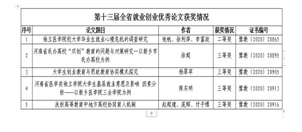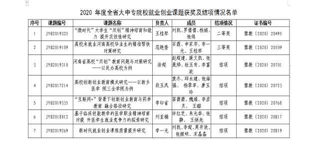 近日,河南省教育厅发布了《关于公布 2020年度全省大中专院校就业创业课题及论文评审结果的通知》。在论文评审中,我校顺利结项7项课题,在结项评审的基础上,我校获得二等奖1项,三等奖1项。在第十三届全省就业创业优秀论文评选中,我校共推荐6篇优秀论文,其中获得二等奖1篇,三等奖4篇。在课题申报中,我校推荐申报课题10项,成功立项7项。